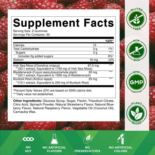 Irish Sea Moss Gummies - 3000 Mg - 60 Vegan Gummies - Made with Bladderwrack & Burdock Root - Seamoss Supplement for Thyroid, Energy, Immune Support